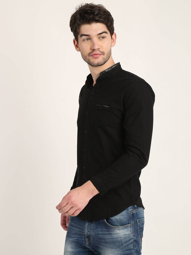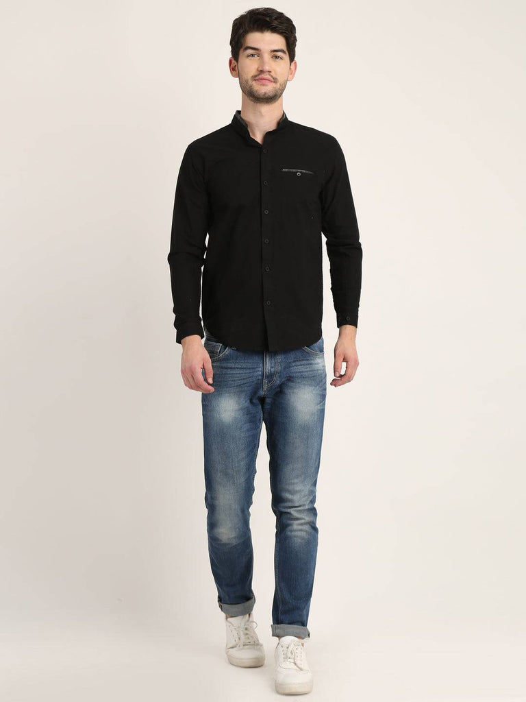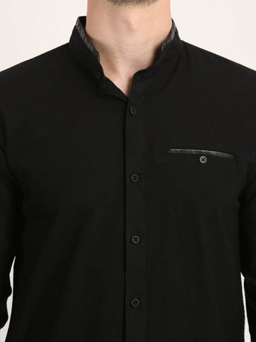 Fit Type: Slim FitFabric: Cotton LinenClosure: ButtonCollar: Chinese CollarSleeve Type: Full SleevePocket: False Pocket with Leather TouchHemline: CurvedSize Instructions: M-38", L-40", XL-42"