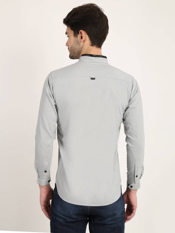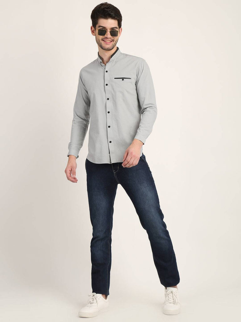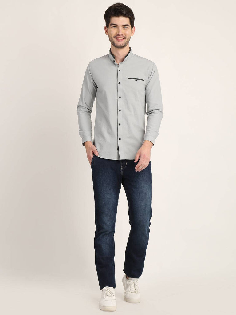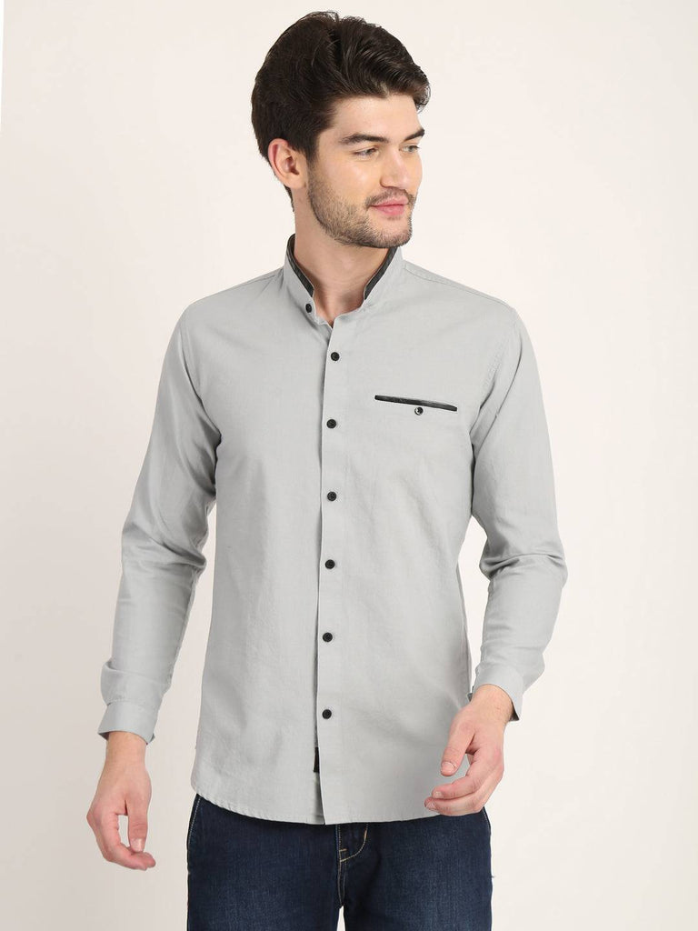 Fit Type: Slim FitFabric: Cotton LinenClosure: ButtonCollar: Chinese CollarSleeve Type: Full SleevePocket: False Pocket with Leather TouchHemline: CurvedSize Instructions: M-38", L-40", XL-42"
