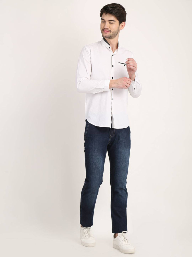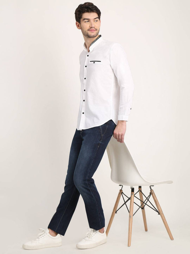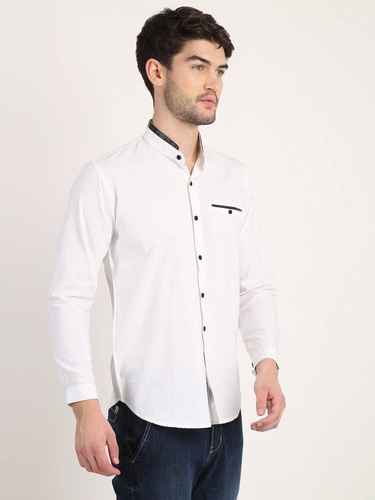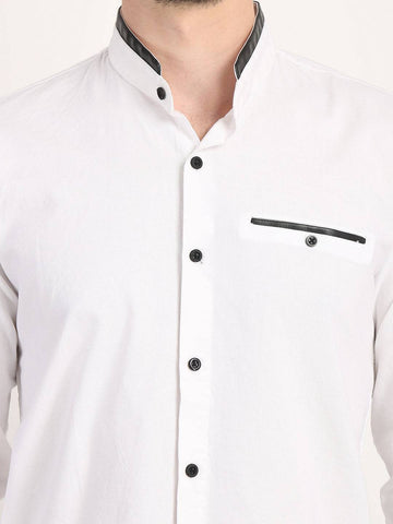 Fit Type: Slim FitFabric: Cotton LinenClosure: ButtonCollar: Chinese CollarSleeve Type: Full SleevePocket: False Pocket with Leather TouchHemline: CurvedSize Instructions: M-38", L-40", XL-42"