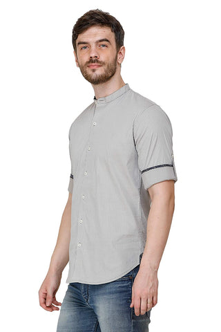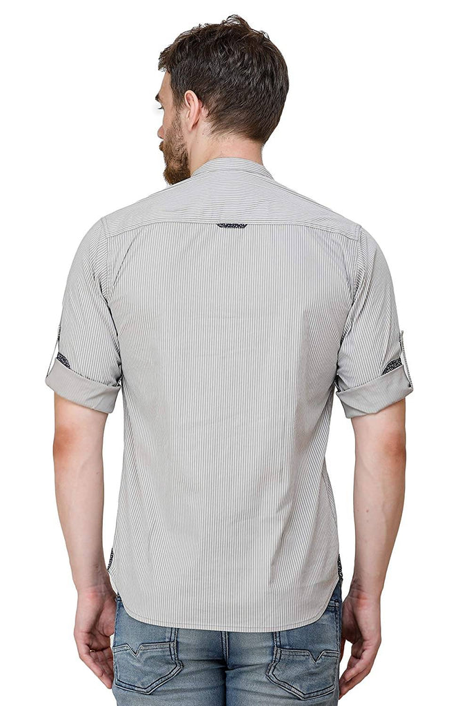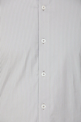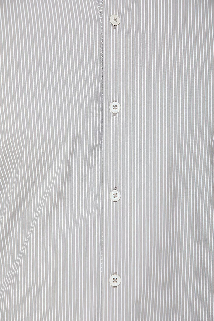 Color: GreyPrint/Pattern: Vertical StripeCollar: Banded CollarHemline: CurvedFabric: Twill Cotton Washed Fabric