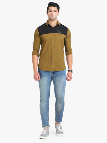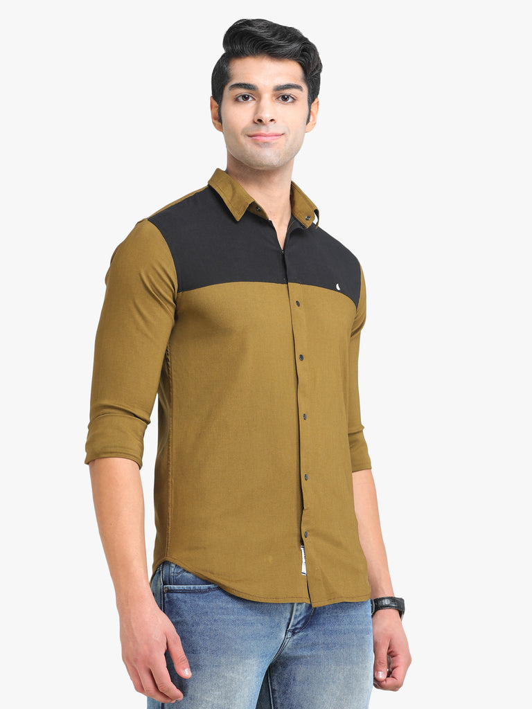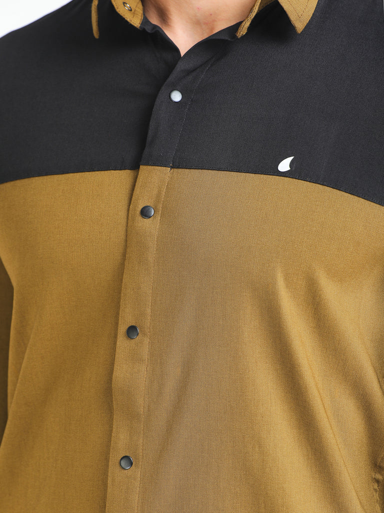 item: slim fit casual shirt color: khaki & black fabric: imported lycra sleeve: full sleeves pattern: colorblock hemline: curved closure: button button type: tich button