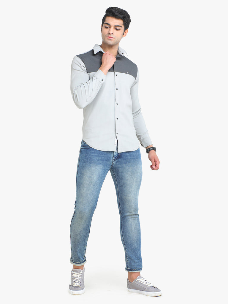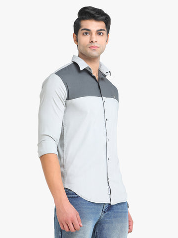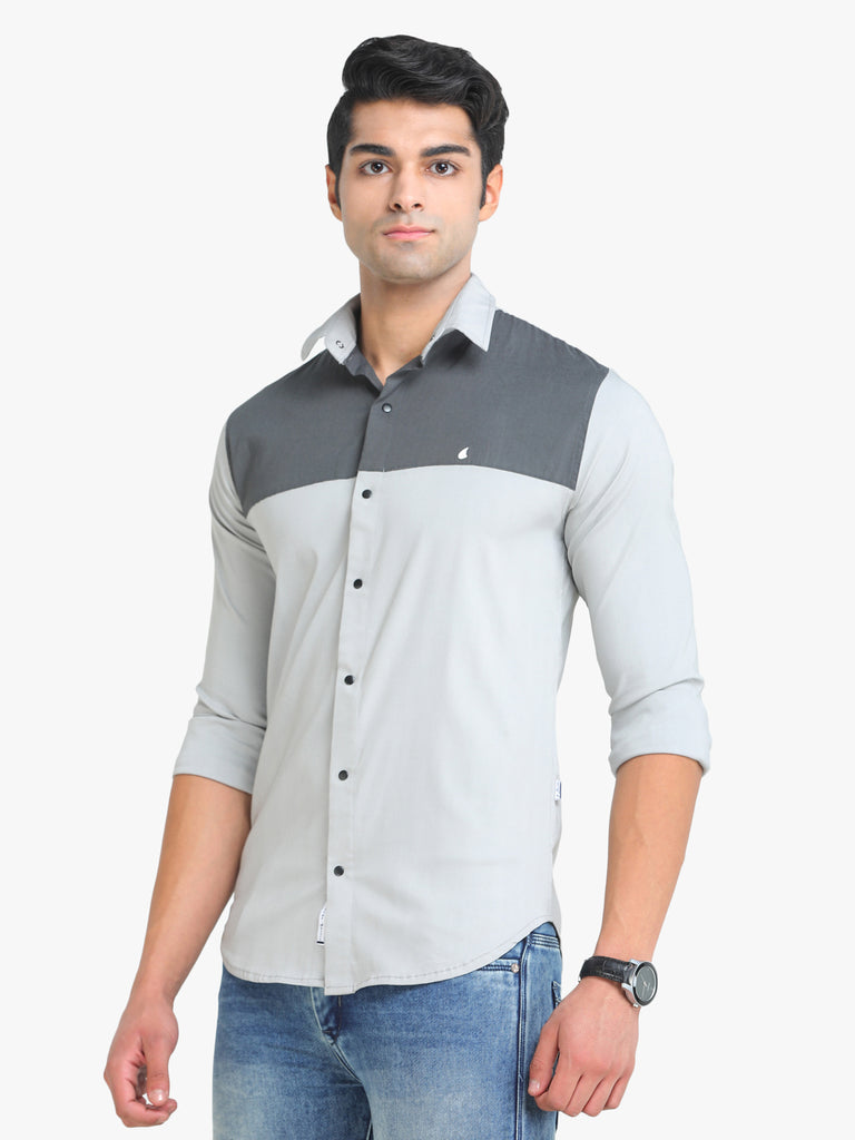 item: slim fit casual shirt color: grey fabric: imported lycra sleeve: full sleeves pattern: colorblock hemline: curved closure: button button type: tich button